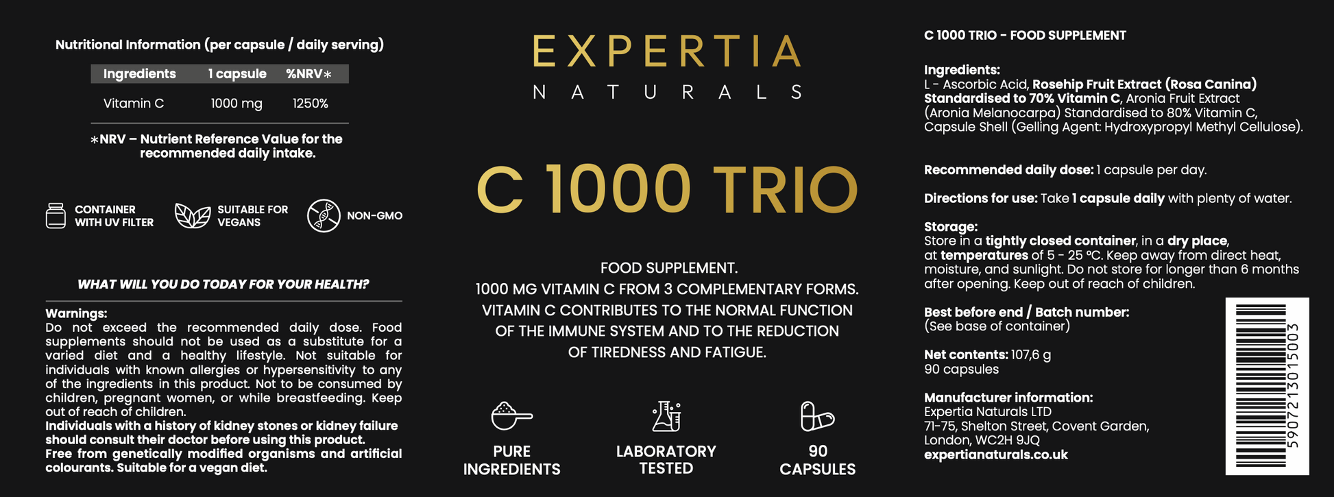 C 1000 TRIO is a food supplement providing 1000 mg of vitamin C from three complementary sources, combining ascorbic acid with natural extracts of rosehip and aronia.