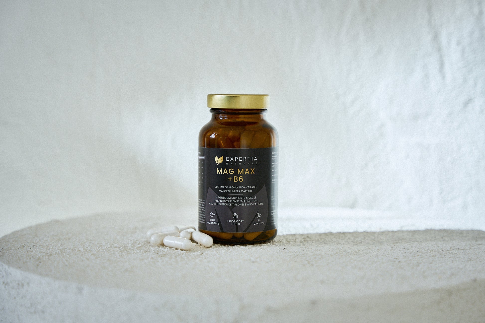 MAG MAX + B6 is a food supplement providing magnesium in forms regarded as highly bioavailable: bisglycinate and chelate. It’s also enriched with vitamin B6, which supports the normal function of the nervous system.